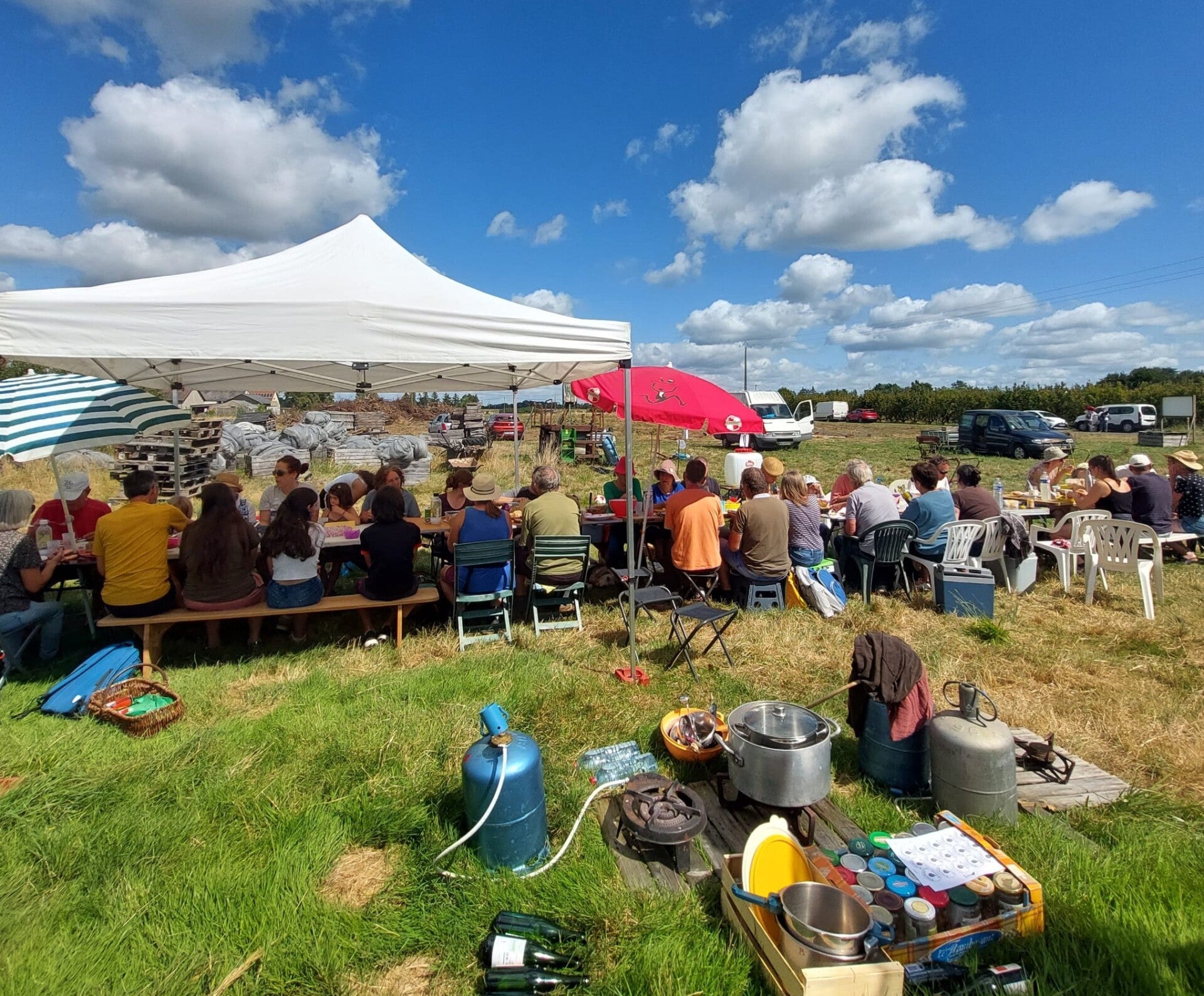 Régulièrement, nous organisons des événements pour célébrer les temps forts au verger: inauguration des chantiers de taille, ouverture de la cueillette, grand ramassage collectif de pommes pour la fabrication du jus, de compote ou de chips.